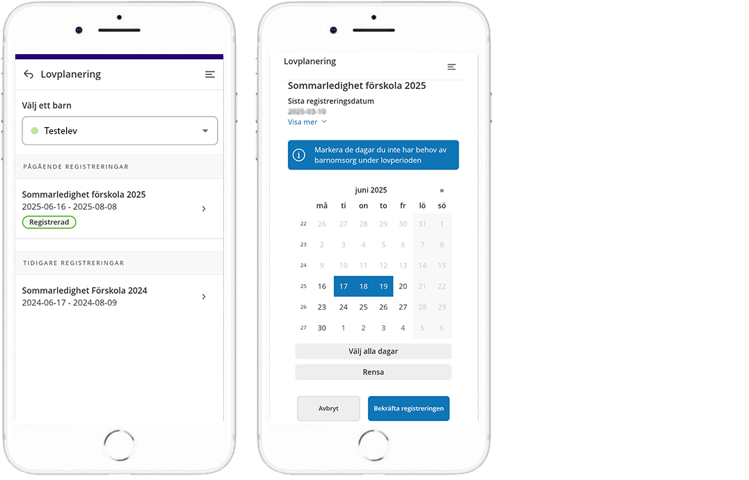 Markera de dagar ditt barn ska vara ledig under lovperioden. När du registrerat alla dagar så klickar du på Bekräfta registreringen. I nästa steg får du en summering av de dagar som registrerats. Stämmer dagarna så väljer du Skicka.