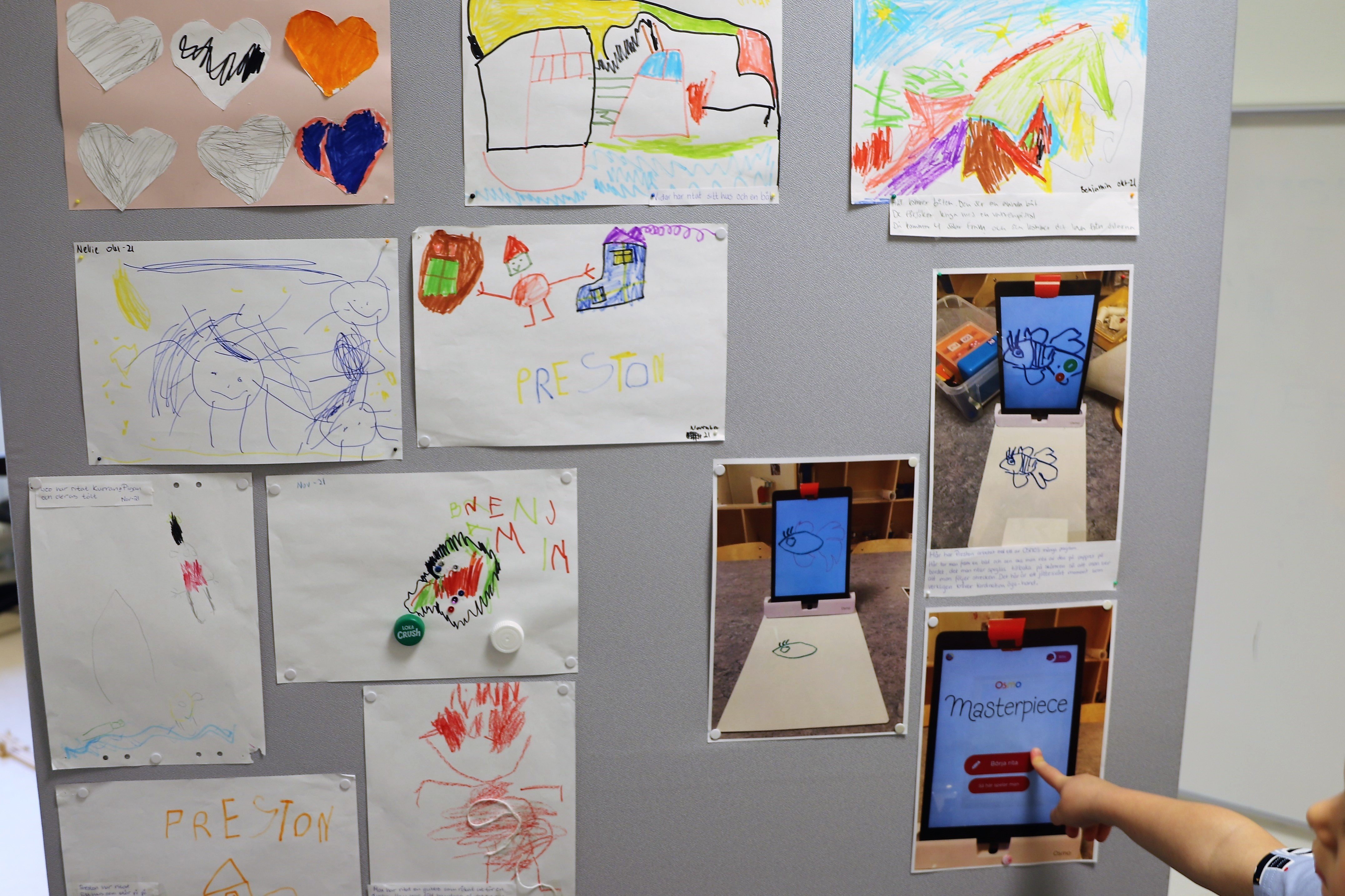 I verksamheten har barnen också ett digitalt hjälpmedel genom en app på en surfplatta. Genom att se sin egen hand på skärmen och samtidigt rita på en whiteboard tränar de på att följa linjer och färglägga ytor. En inte helt enkel uppgift enligt barnen.