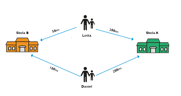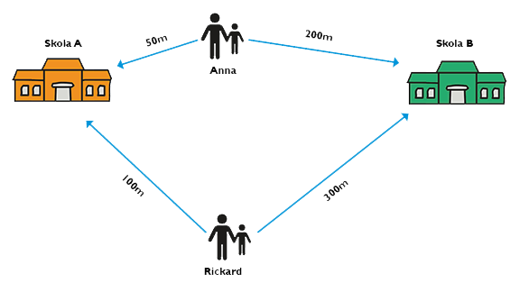 Exempel 1 Både Anna och Rickard har önskat Skola A. Anna har 50 meter till Skola A och 200 meter till Skola B. Hennes relativa närhet blir 200–50=150. Rickard har 100 meter till Skola A och 300 meter till Skola B. Hans relativa närhet blir 300–100=200. Med andra ord är det Rickard som ”förlorar” mest på att inte få skola A eftersom han får störst skillnad i skolväg om han istället får skola B. Det är därför Rickard som får en plats i skola A, även om Anna bor närmre. |