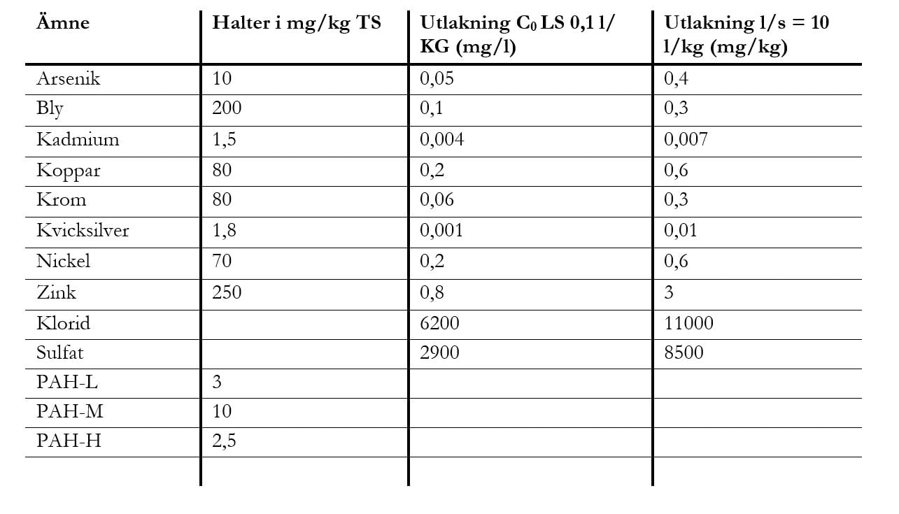 Massor som tas emot ska innehålla föroreningshalter som underskrider nivåerna som anges i Naturvårdsverkets handbok 2010:1, tabell 6, avseende totalhalter och utlakning. Analys ska ha gjorts av ackrediterat laboratorium.