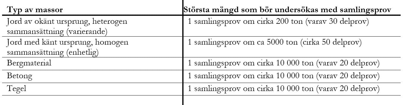Provtagning ska ha utförts av sakkunnig och på sådant sätt att analysen är representativ för den volym massor som ska lämnas. Antal prover och provtagningssätt ska kunna redovisas av avlämnaren i samband med att inlämning av provtagningsresultat. Provning kan ha utförts genom prov på uppgrävda massor eller genom markprov om dessa bedöms ge tillräcklig kunskap om massornas innehåll och egenskaper.