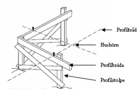 Profilstolpar och profilbrädor sätts upp av den sökande. De placeras utanför hushörnen med profilbrädorna i samma höjd vid alla hörn. Vid utstakningen slår vi ut spik på profilbrädorna och spänner profiltrådar mellan profilerna.
