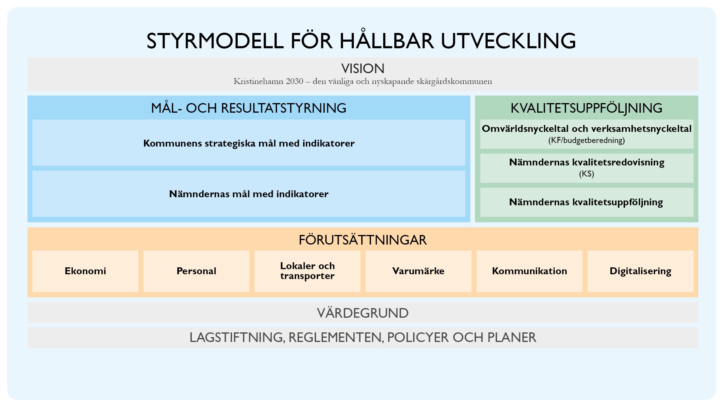 Kristinehamns kommun har en styrmodell som är vägledande för hur vi ska arbeta med ekonomi, budget och verksamhet. Den fungerar också som ett stöd inför strategiska beslut. I styrmodellen finns även kommunens strategiska mål.