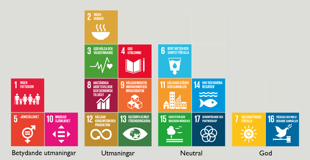 Vill du läsa mer här på webben? Klicka på boxarna nedan för mer information av varje mål och hur vi ligger till i förhållande till dem. Längre ner kan du också klicka dig in på och läsa en summering av nuläget i Kristinehamns kommun. Referenser och mer information finns i PDF:en.