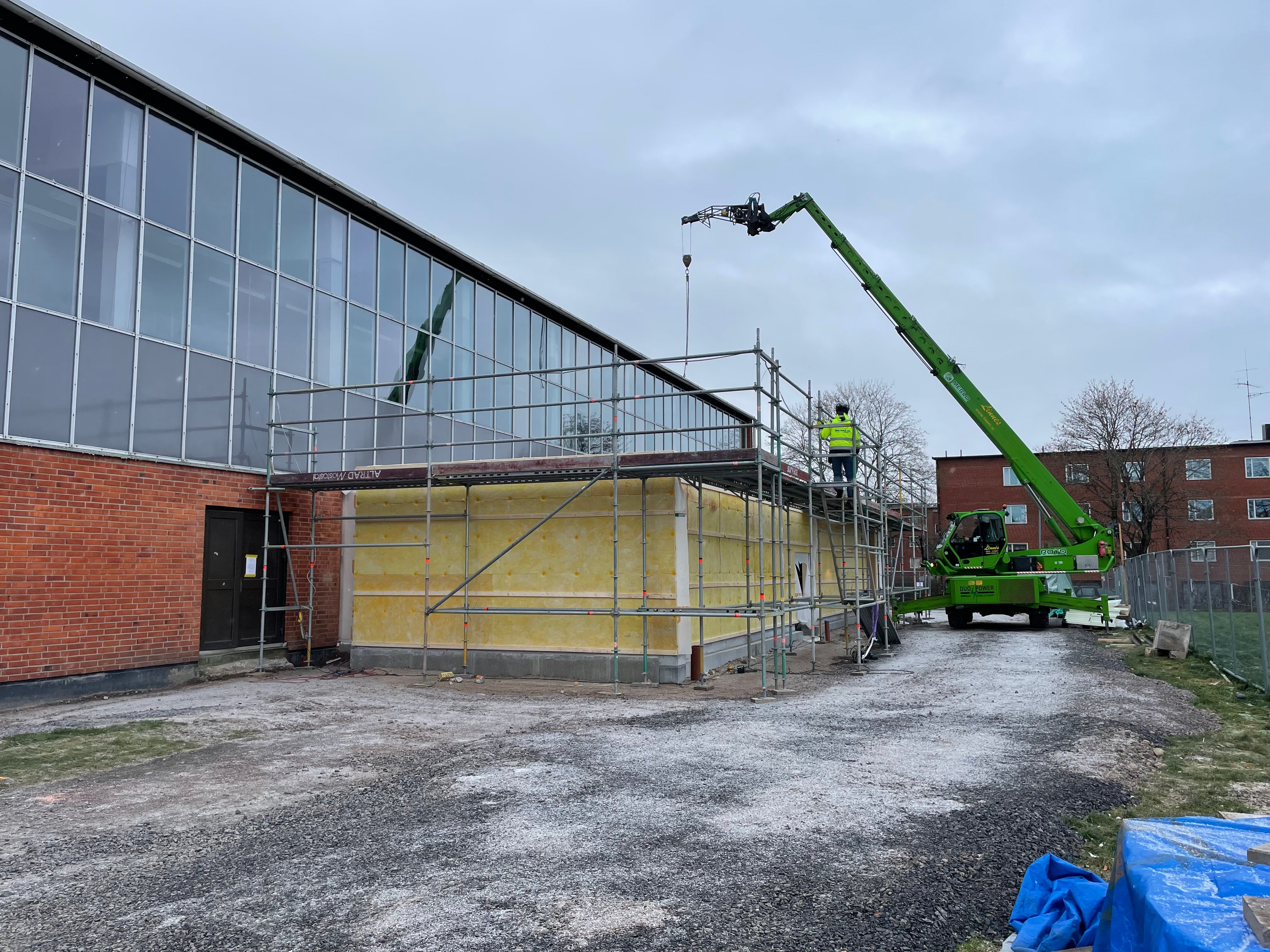 Projektet startade i september 2023 med dränering, grundläggningen för en utbyggnad med förråd och ett fläktrum på baksidan mot fotbollsplanen. Ombyggnationen blev klar i början av höstterminen 2024.