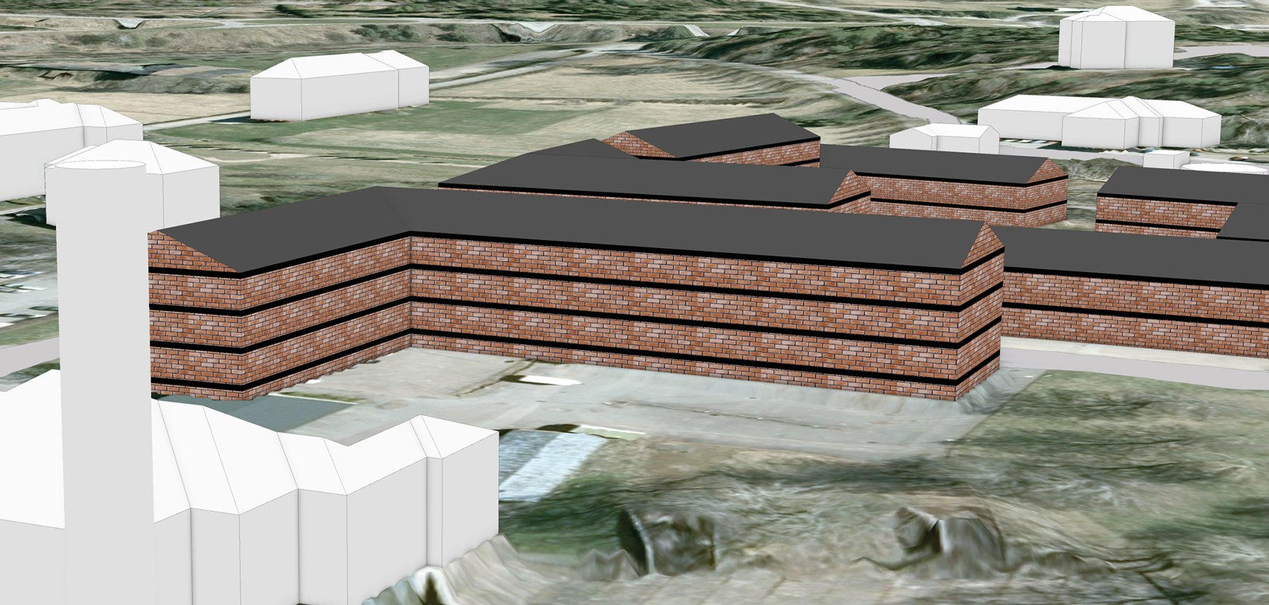 En viktig del i arbetet med att ta fram den nya detaljplanen är att nya byggnader ska passa väl in bland befintlig bebyggelse. Nya byggnader ska vara i rött tegel men får innehålla inslag av trä och puts (som radhusen i väster)