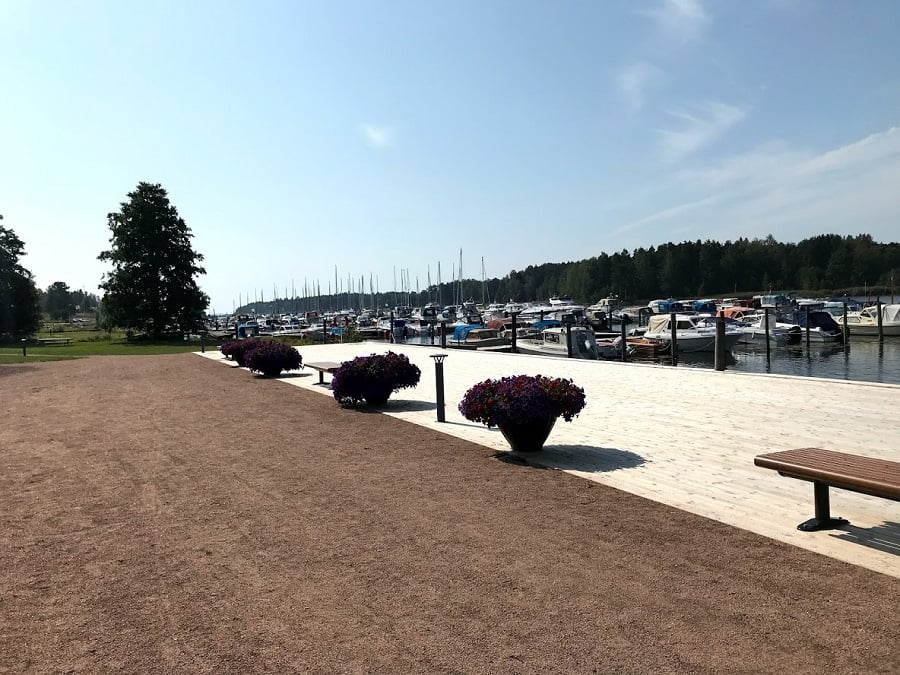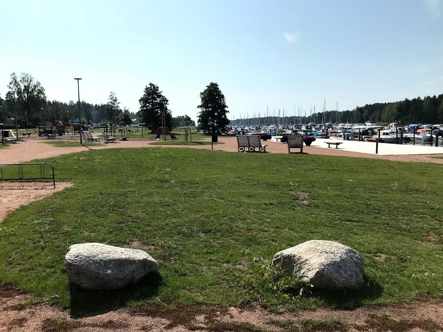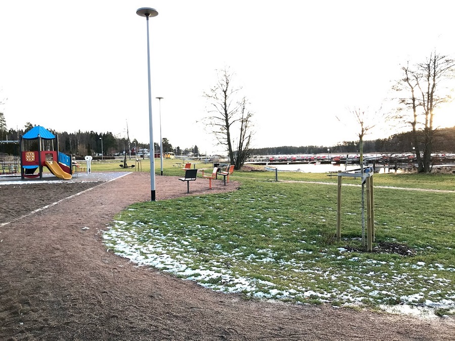 En stor bred remsa mellan Vålösundsvägen och vattnet kallar vi för Skärgårdsparken. Stadens utveckling med utbyggnad mot vattnet har i samband med att kommunen drog fram kommunalt vatten och avlopp också inneburit en omvandling av fritidshusområdet till åretruntbostäder. I samband med genomförandet av detaljplanerna som reglerar den allmänna platsmarken har en satsning gjorts på byggnation av en ny större lekplats vid vattnet, vilken stod klar sommaren 2019.