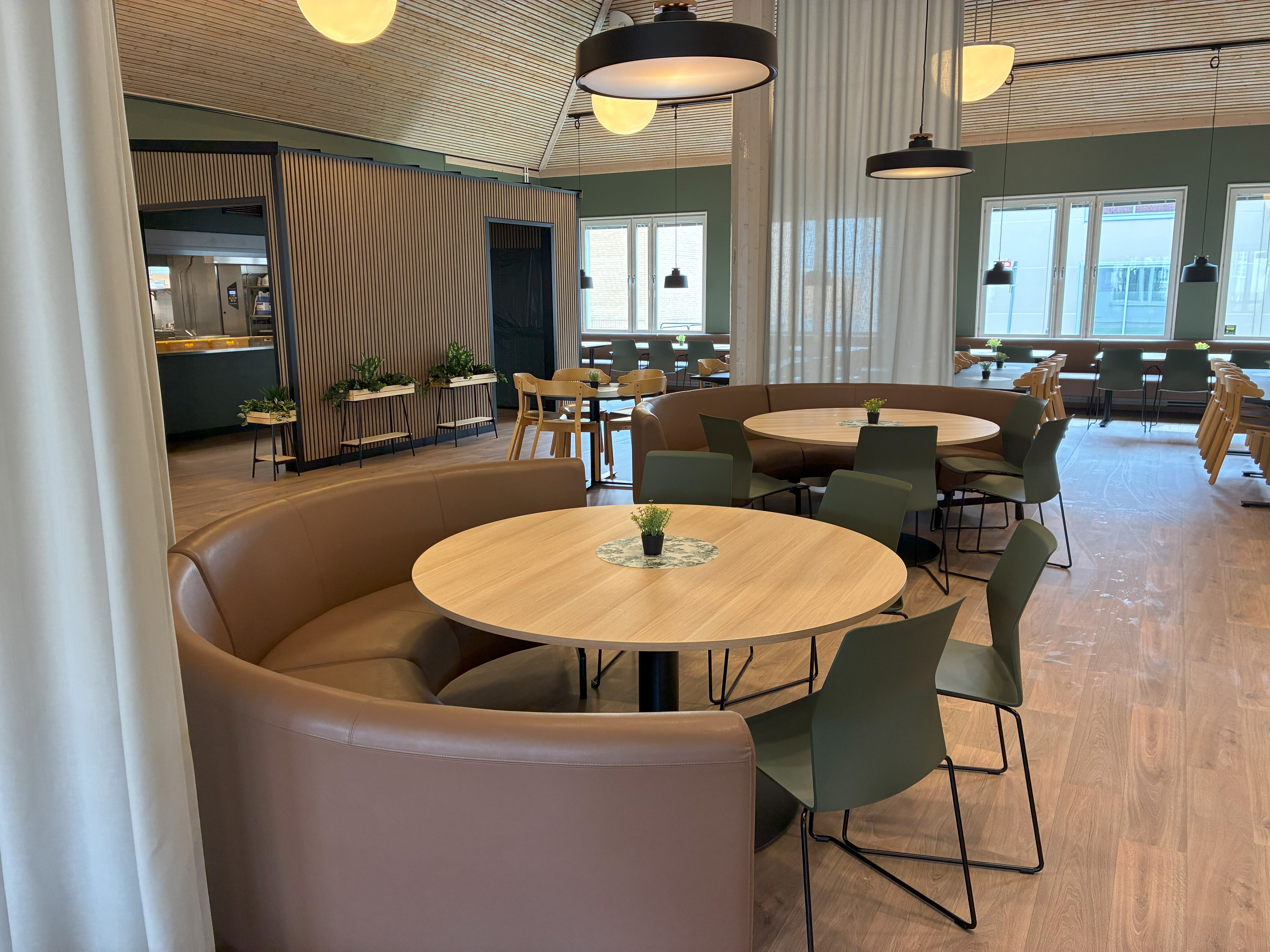 Elevernas tidigare bildcollage och samtal under workshopsen har satt tydliga spår i inredningen. Runda bord, olika sittmiljöer och delvis nya stolar gör att eleverna både kan äta och umgås på ett bekvämt sätt. Ljusinsläppet har förstärkts, ljudmiljön är dämpad och de naturnära färgtonerna ger som eleverna säger, en känsla av restaurang på riktigt.