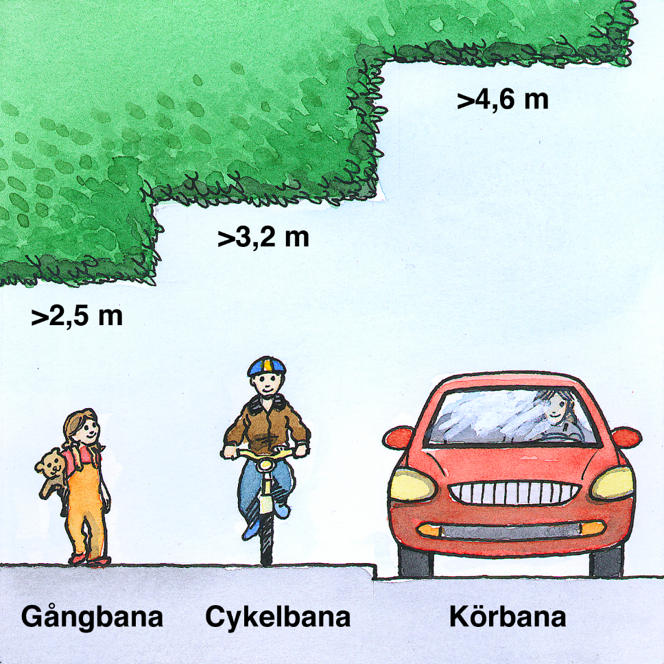 Om du har buskar eller träd som sträcker sig ut över gatan eller gångbanan bör du se till att det finns fri höjd för trafikanterna. Den fria höjden som krävs är: